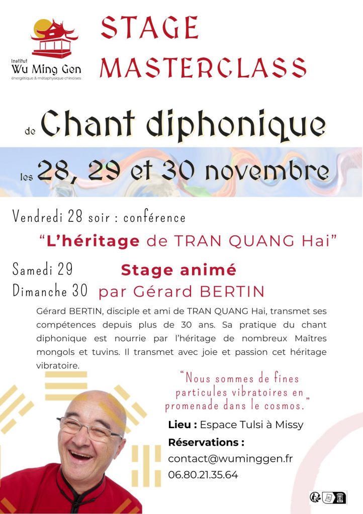 • Vendredi soir : Une conférence sur l’héritage de TRAN QUANG HAI qui permettra de découvrir l’univers incroyable et vibratoire du chant des harmoniques.